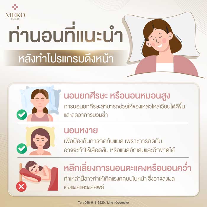 การดูแลตัวเองหลังทำโปรแกรมดึงหน้าเป็นสิ่งสำคัญ! ค้นพบท่านอนที่ถูกต้องและข้อควรระวังอื่นๆ เพื่อลดอาการบวม ช้ำ และช่วยให้แผลสมานเร็วขึ้น มั่นใจในผลลัพธ์ที่สวยงามและคงทน